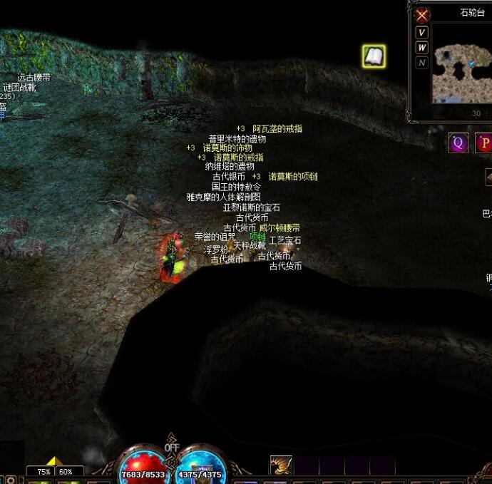 成掉落()古代货币*5、亚黎诺斯的宝石、 雅克摩的人体解剖图 、国王的特赦令 、古代银币威尔顿腰带、 纳维塔的遗物 、+3 诺莫斯的戒指 、+3 诺莫斯的饰物 、荣誉的诅咒 、普里米特的遗物 、浮罗粉 、+3 阿瓦垄的戒指 、+3 阿瓦垄的项链 、工艺宝石